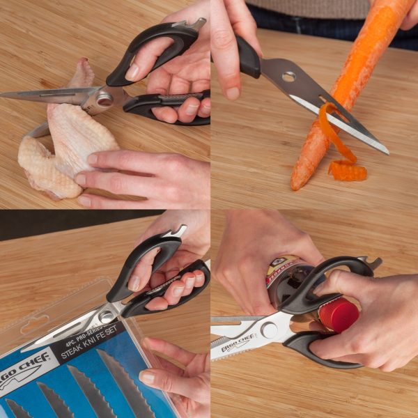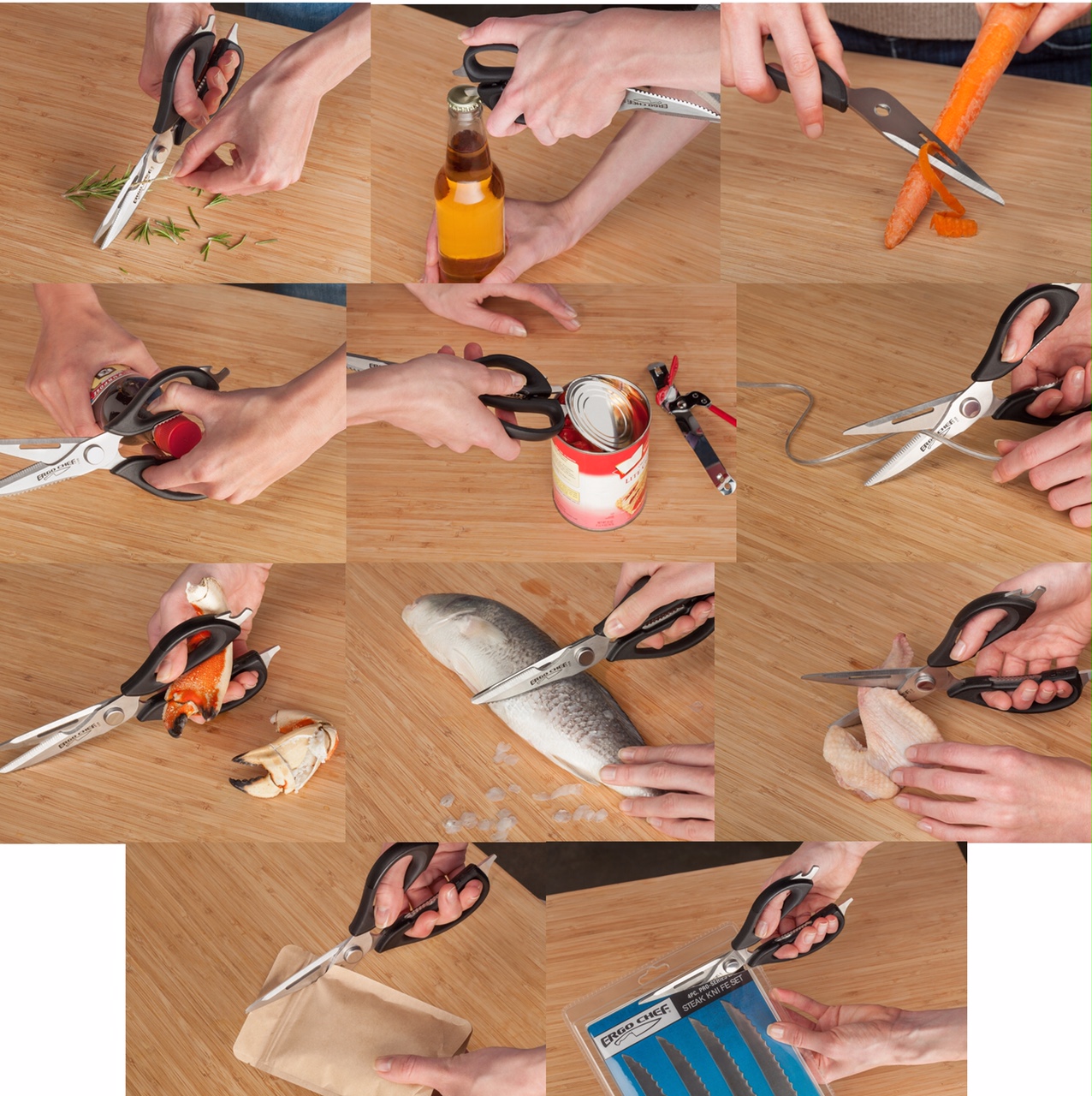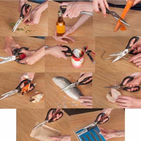 - Multi Function – Cutting & trimming meat, herb stripper, peeler, fish scaler, bottle opener, chicken bone cutting notch, twist cap bottle opener inside of handle, and lid lifter/screw driver on end of handle.