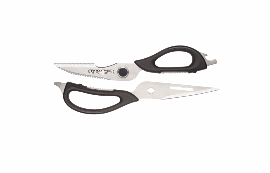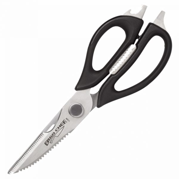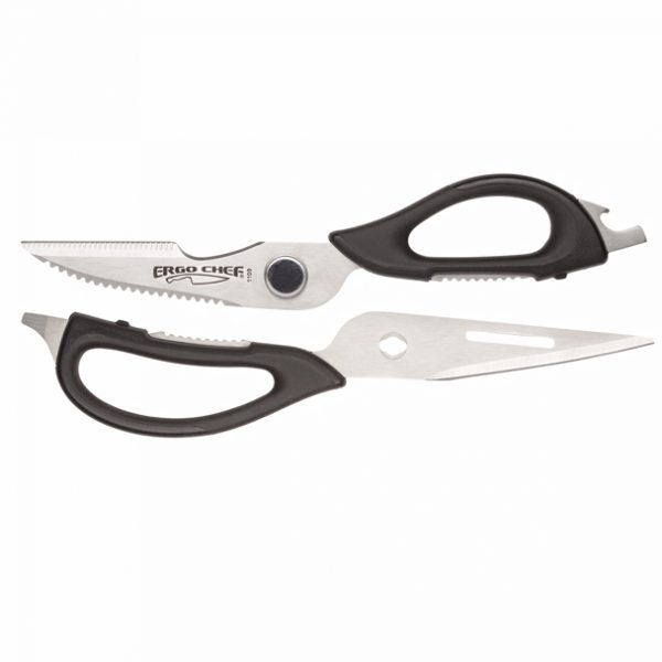 The Ergo Chef Pro-Series heavy duty carbon stainless steel kitchen shears are a total of 8.750″ long and come apart for easy cleaning. The blades are 3.375″ long. Key Features: Durable ABS & ergonomic non-slip grip handle. Bone cutter & Wire Notch, Vegetable Peeler slot in blade, also good for herb stripper, one side wavy edge fish scalier, Bottle Opener, Twist Bottle Opener and Nut & Lobster Cracker in the middle of the handle, and screw driver/ lid lifter. A Multiple Purpose Shear that gets many jobs done and a must have in any kitchen.